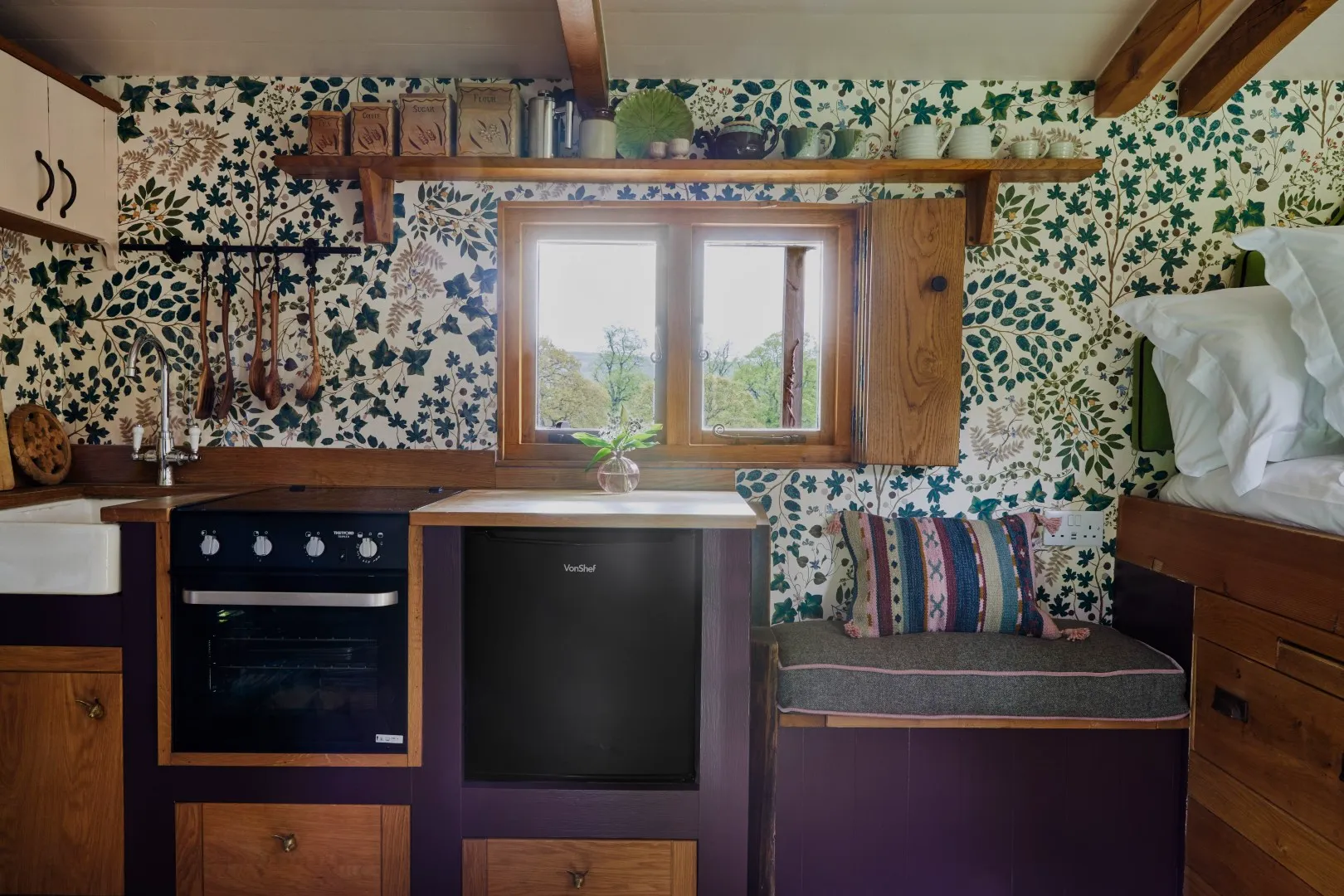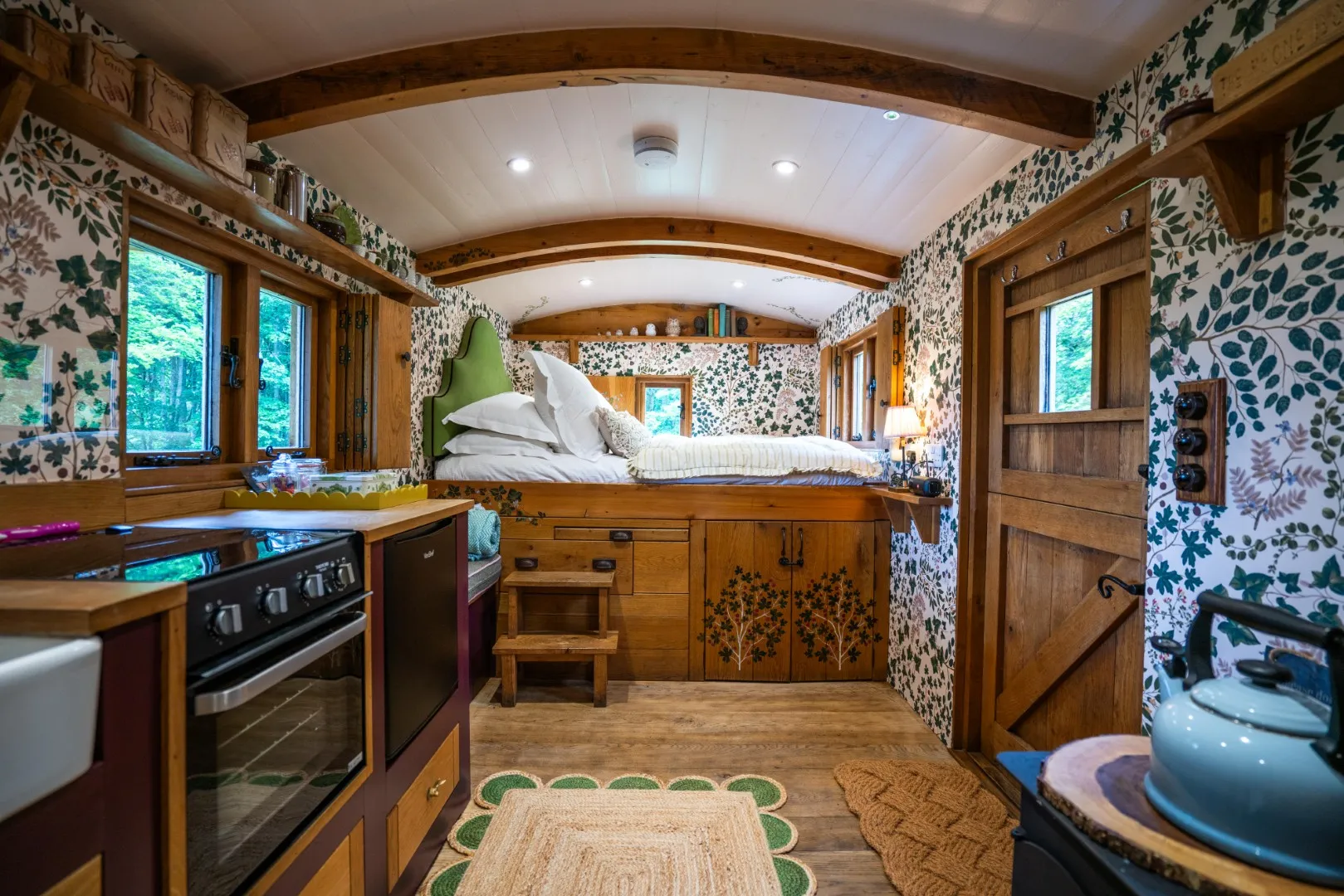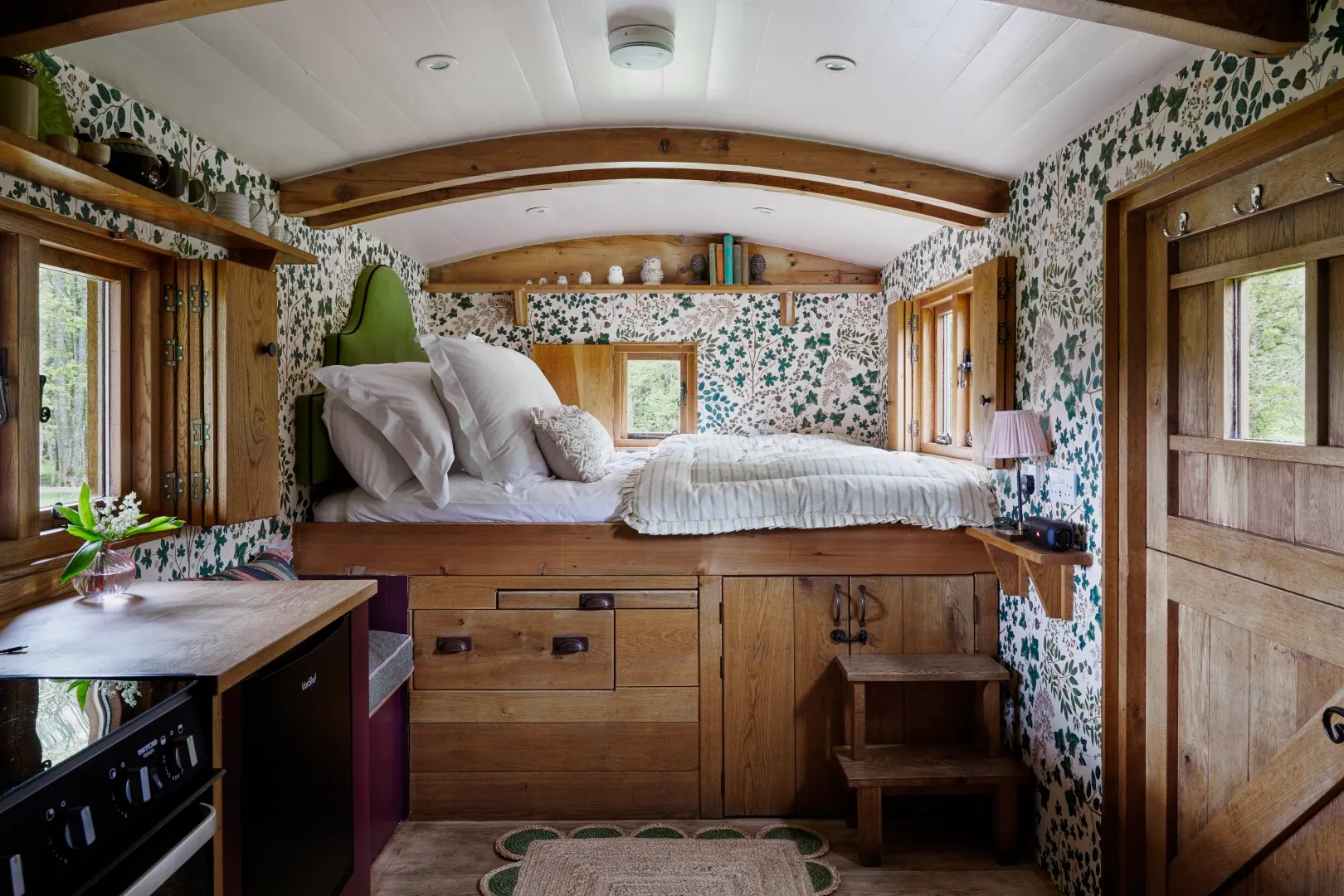 With charming Hansel and Gretel good looks, this enchanting little chapel on wheels is an irresistible hideaway for up to 2 guests. Filled with little luxuries including a sumptuous king-size bed, magnificent freestanding copper roll-top bath, en-suite shower and charming wood-burning stove.