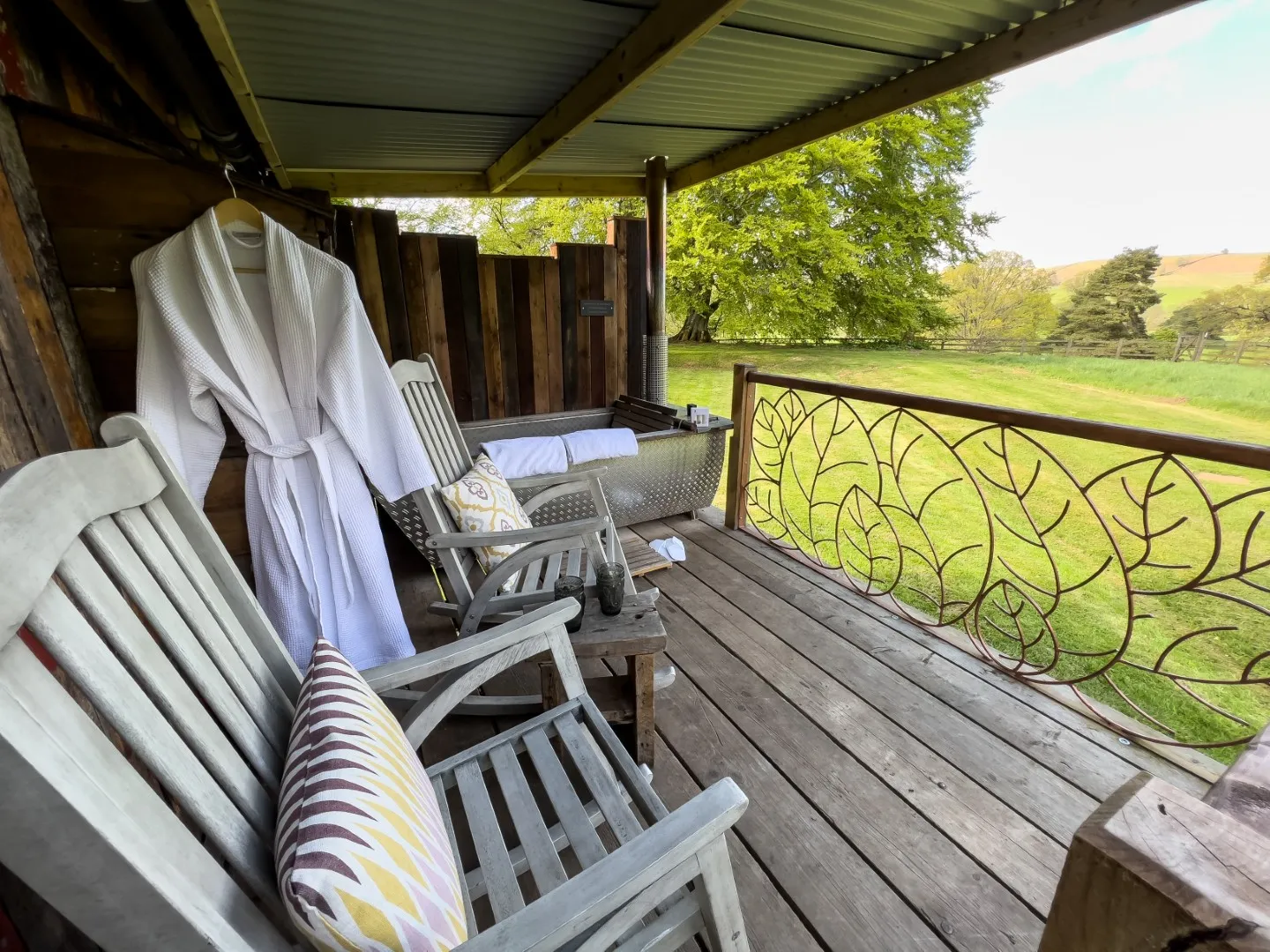 A little slice of heaven, Bracken is an utterly charming Shepherd’s Hut with beautiful views over the stunning Hesleyside Estate parkland. Handcrafted using reclaimed Oak from an old flour mill, the delightfully rustic exterior is complemented with a plush and fully equipped interior. A wood-burning stove & oven, en-suite shower room with fluffy towels and flushing loo, king-size bed – plus some magical little extras including a star-gazing kit and marshmallows just waiting to be toasted, means plans to travel far and wide may well be forgotten as you settle into this beautiful, accommodating space to enjoy a different kind of Shepherd Huts holiday. The covered veranda has rocking chairs and a huge wood-fired outdoor bath.